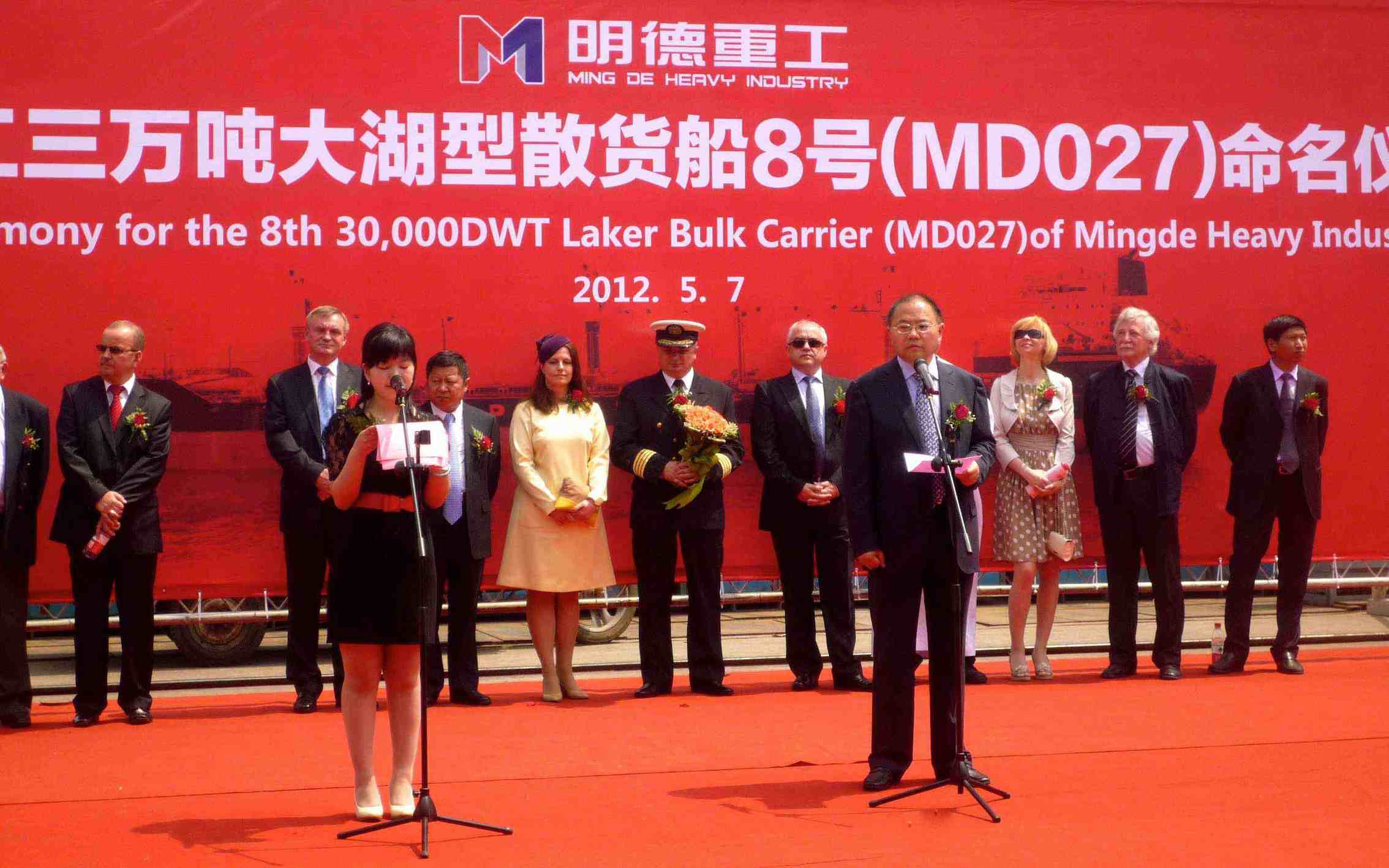 2012年5月7日上午,我司承建的30000吨第8号大湖型散货船命名仪式在南通造船厂3号码头隆重举行。教母Ms. Ola Czapska 命名该船为“MAMRY”。船厂董事长季总、我司总经理陆恺先生、船东波兰PZM公司技术与投资部经理 Mr. Leszek Trachimowicz 先后致辞,祝贺30000吨8号大湖型散货船命名为 MAMRY号并感谢所有为这艘船建造付出努力的各界友人、船东监造及船厂员工。
