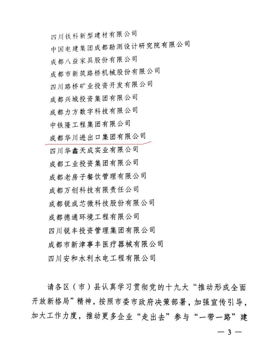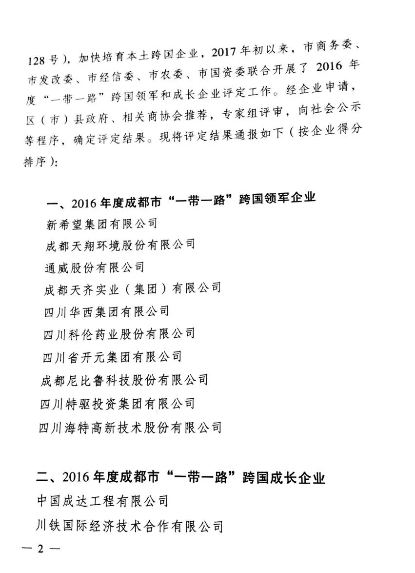 2018年1月10日,我司在市商务委、市发改委、市经信委、市农委、市国资委联合组织的2016年成都市“一带一路”跨国领军和成长企业评选中,荣获2016年度成都市“一带一路”跨国成长企业称号,入选成都市“一带一路”跨国成长企业。